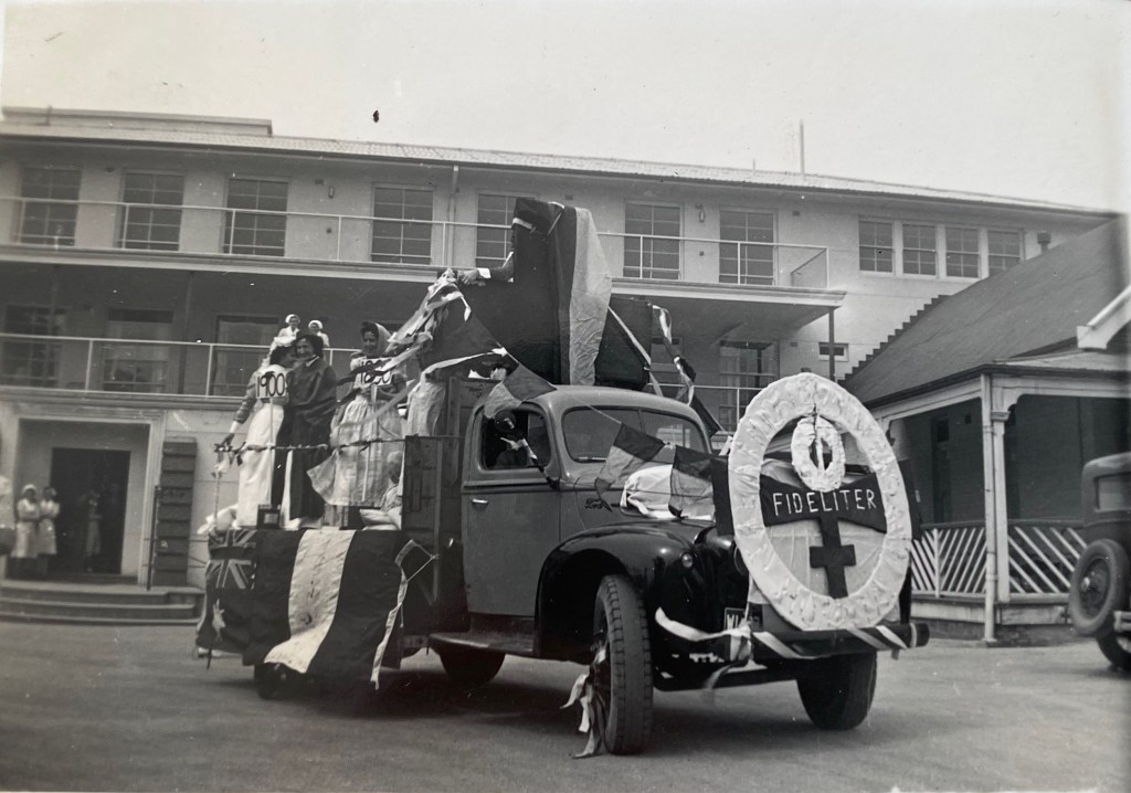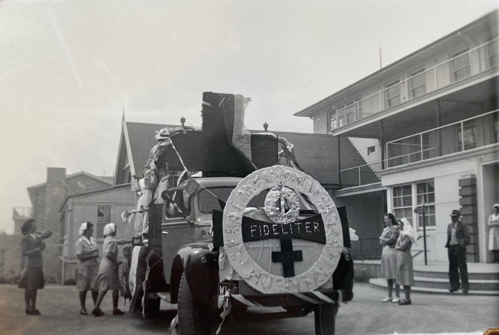 Next came Penelope’s hospital float, draped with flags including the Red Cross, the Australian flag and the Union Jack. Colourful bunting adorned the Ford’s hood and a very large handmade replica of Armidale & New England Hospital’s badge was affixed to its front; conceivably obscuring the driver’s view, but apparently not proving enough of a hindrance to have bothered anyone.
