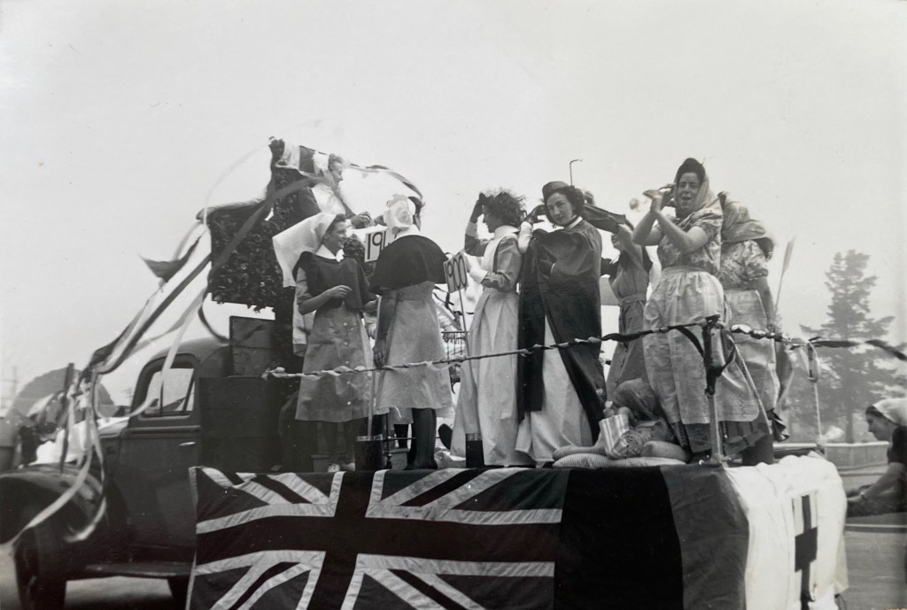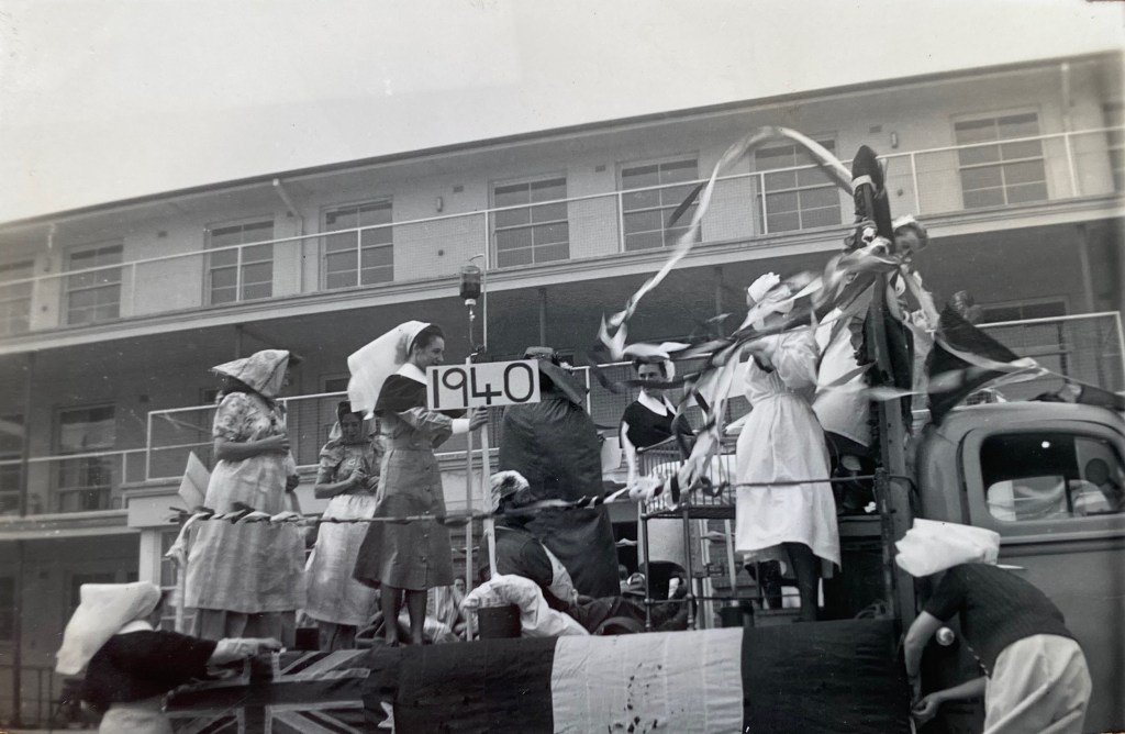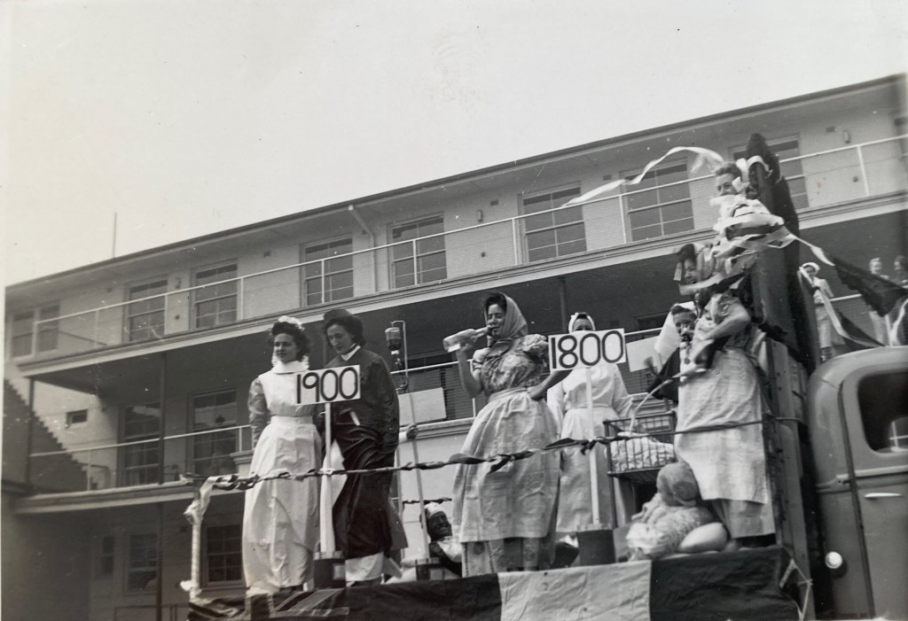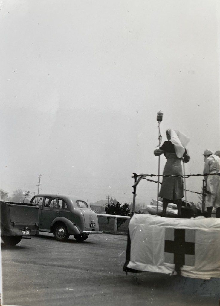 As the years progressed, so too did the quality of care dispensed by the nursing profession. This was reflected in the hospital float’s depiction of subsequent eras: from the saintly Florence Nightingale with her lamp, to the 1940s nurse with her heavily bandaged (and bloodied) war casualty.